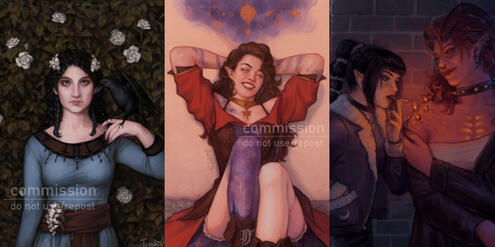 I will send frequent updates throughout the process, it is highly encouraged that you communicate anything you want tweaked or changed during this time. I might make alterations on my own, if I think it'll make the piece better, but I'll show, explain the changes, and ask for confirmation if you'd like to keep the alteration or not. Once finished, I'll send a small screenshot of the completed piece and ask if there are any final edits you'd like me to make, then it's onto the final payment.Final Payment/Arrival:Once we have confirmed that the piece is complete, the full file will be uploaded and sent to you through Google Drive. If paying 50/50, I'll send an invoice for the final 50% before sending the full file. I'll have an alternate file, that is resized and watermarked as a commission, that I'll continue to use as example of my work and for my personal advertisement. The full, unwatermarked (though still signed), image is yours for personal use. Please credit when using the piece on social media!